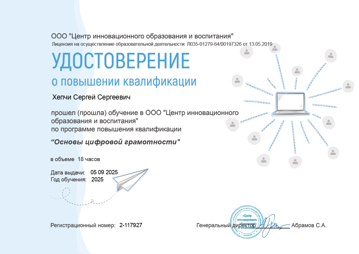 - обучение по программе повышения квалификации «Основы цифровой грамотности», ООО "Центр инновационного образования и воспитания", г. Саратов, 18ч, 2025г.