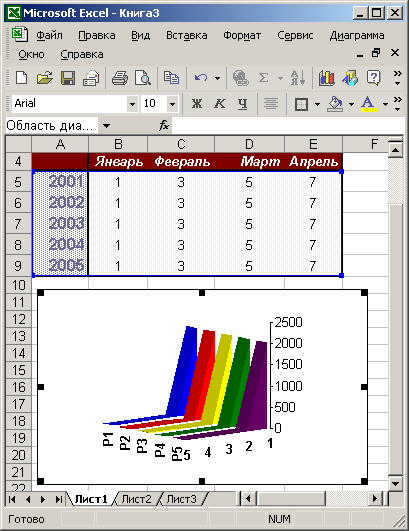 Объемный вид доступен для тех типов диаграмм, в которых ряды данных выводятся объемными маркерами типа цилиндров или пирамид. Наличие третьей оси координат при этом не обязательно.