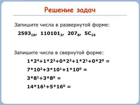 Решение задач Запишите числа в развернутой форме: 2593 , 110101 , 207 , 5С 16 8 10 2 Запишите числа в свернутой форме: 1*2 +1*2 +0*2 +1*2 +0*2 = 0 3 1 4 2 7*10 +3*10 +1*10 = 0 1 2 3*8 +3*8 = 1 0 14*16 +5*16 = 1 0