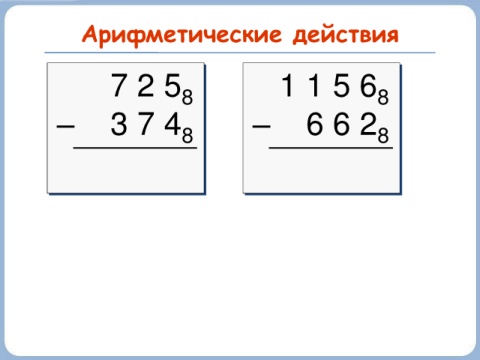 Арифметические действия 7 2 5 8 1 1 5 6 8 – 3 7 4 8 – 6 6 2 8