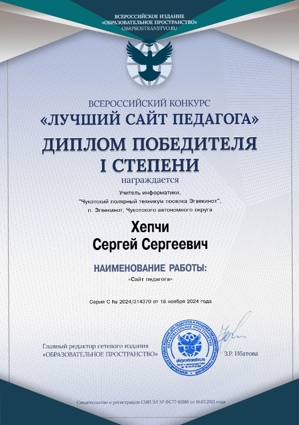 Диплом победителя I степени конкурса «Лучший сайт педагога» сетевого издания «Образовательное пространство»