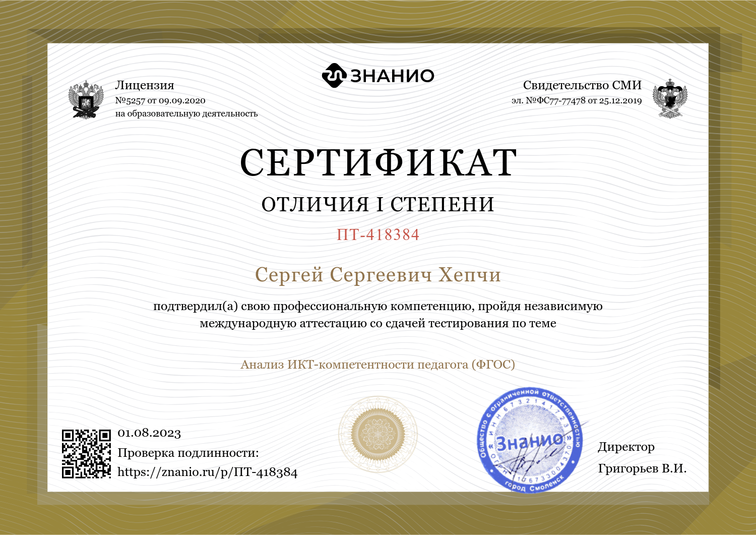 Сертификат отличия I степени подтверждающий профессиональную компетенцию