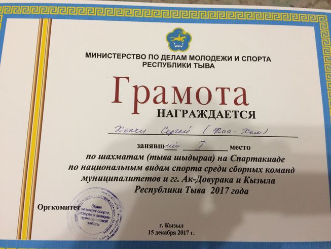I место в Республиканской Спартакиаде по национальным видам спорта, вид спорта "Тувинские шахматы" - 2017г.