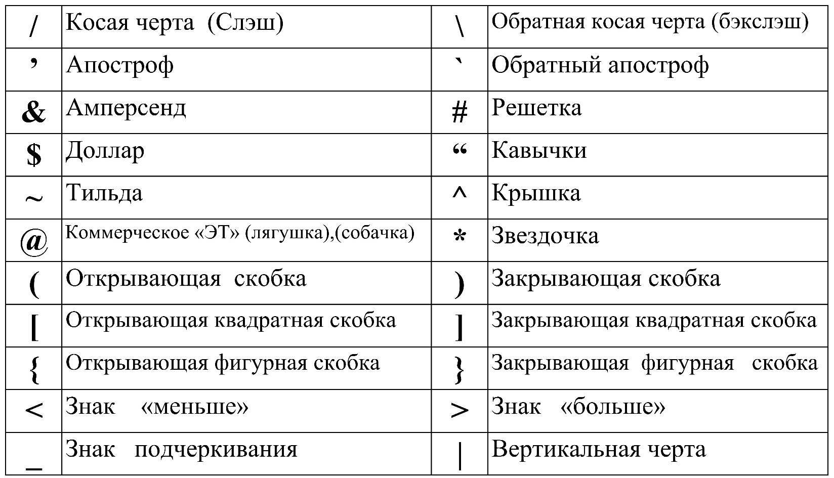 Названия некоторых символов
